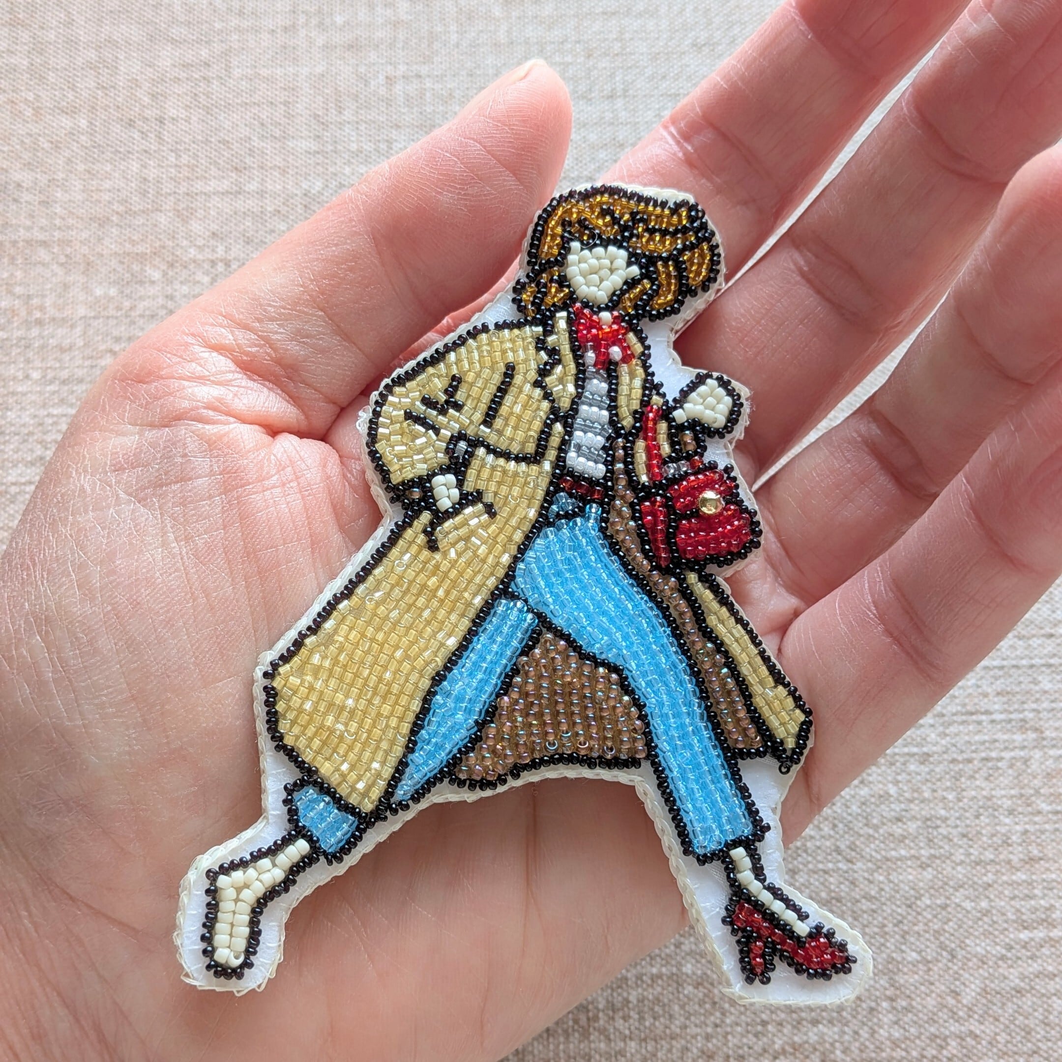 この作品は、そんな「必死に行動している瞬間」をビーズ刺繍で切り取った作品です。